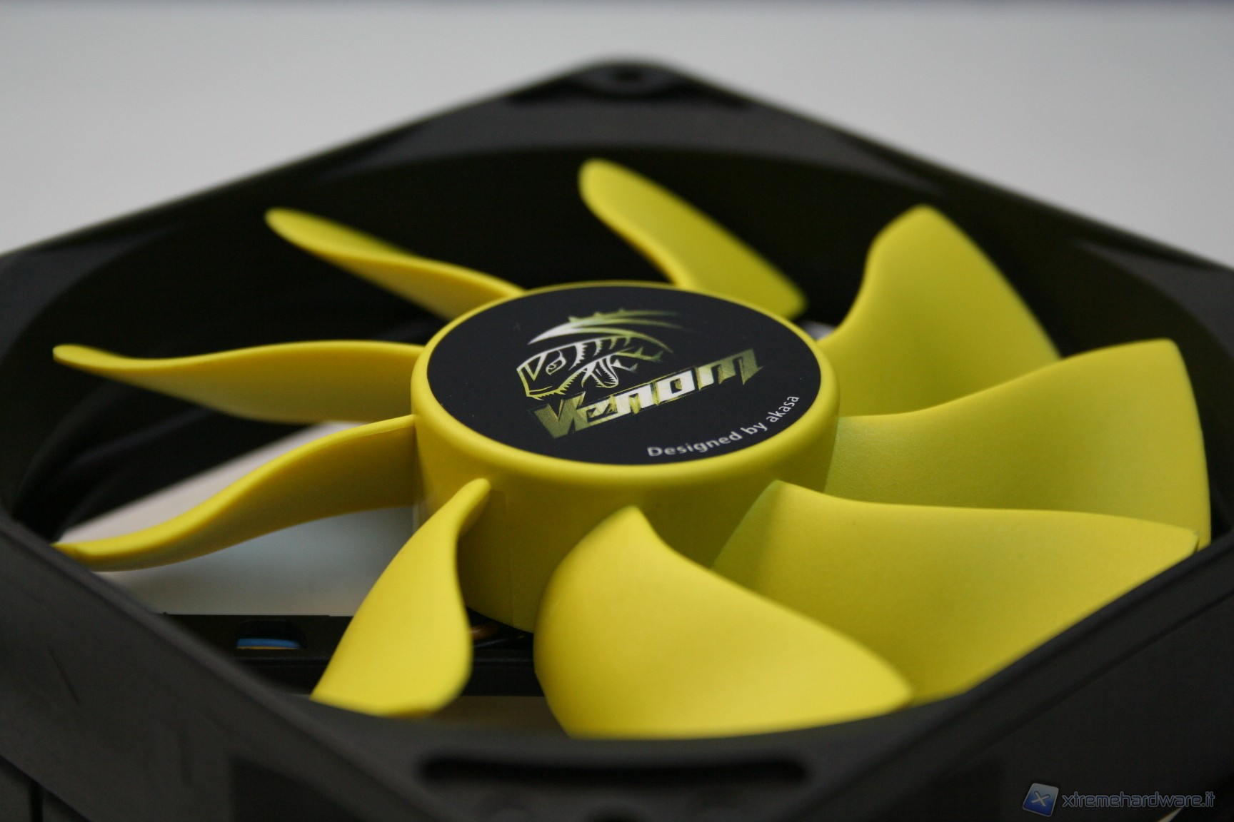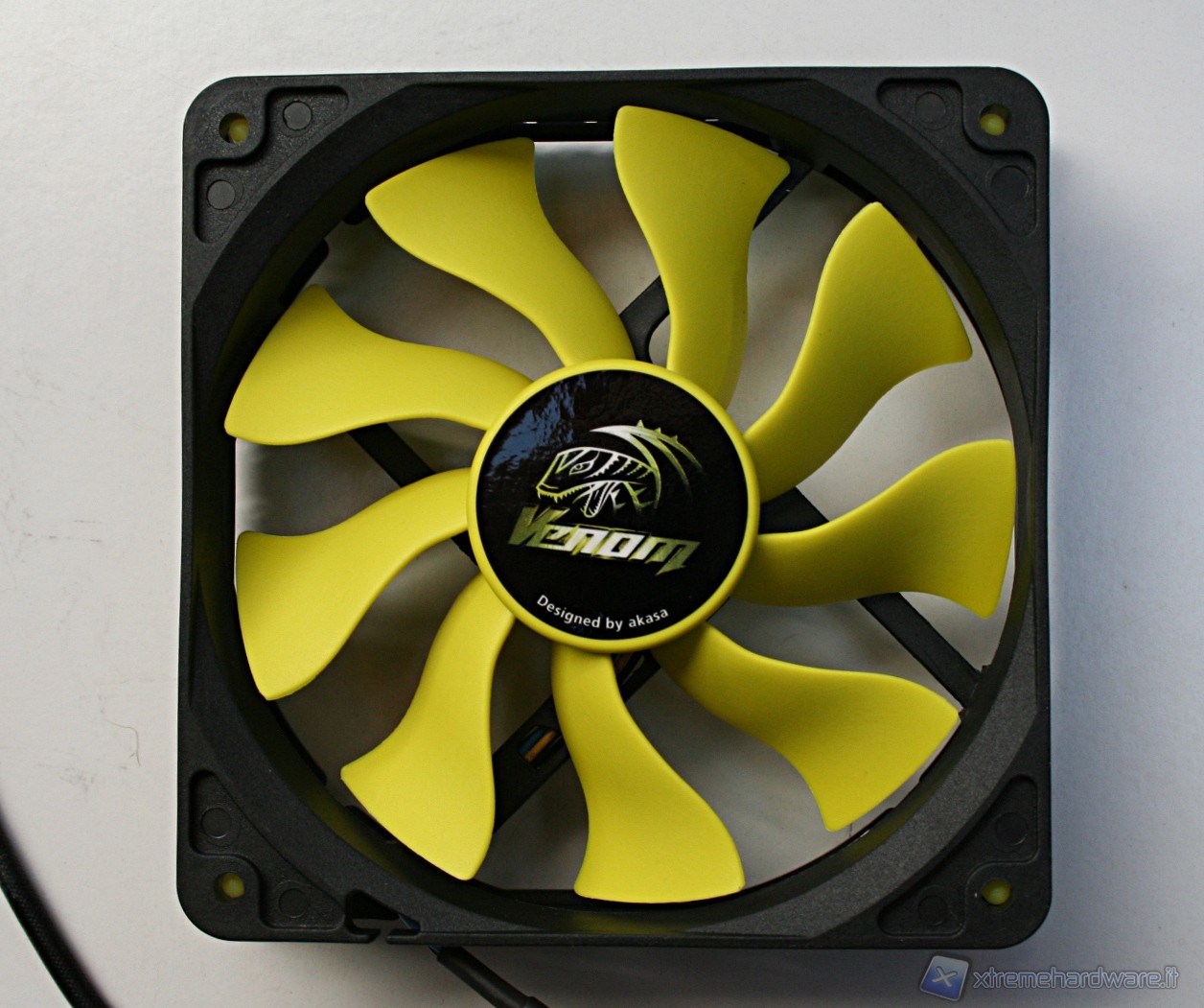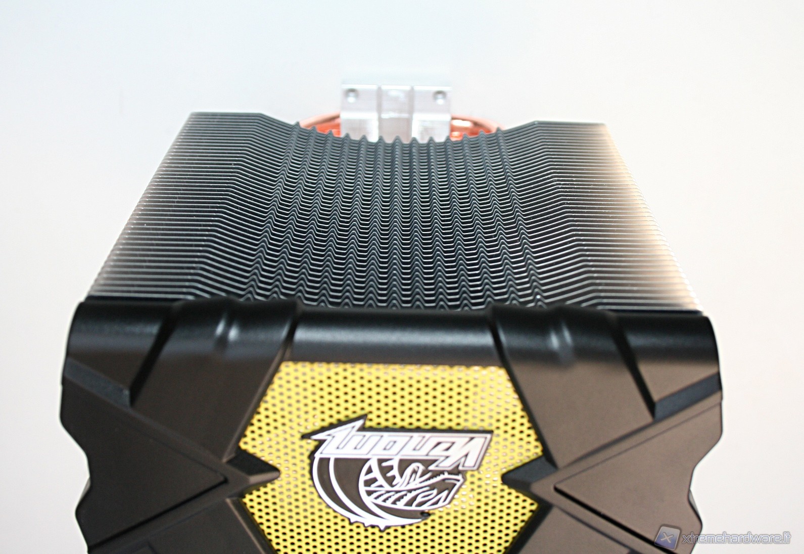 Nella parte superiore c’è una copertura di plastica dura con il logo Akasa sovrapposta ad una copertura a griglia metallica con colorazione gialla, tutto ciò conferisce un aspetto molto aggressivo e davvero di impatto. Il radiatore presenta delle lamelle sufficientemente spaziate (spesse 0.5mm e spaziate 2mm), di modo che il flusso d’aria non venga eccessivamente ostruito. Con questa struttura ci sono pochissime zone morte dove l’aria non riesce a passare, precisamente dietro ognuna delle heatpipe; in linea teorica potrebbe venire a formarsi un piccolo triangolo non areato, ma comunque è un discorso valido per una buona parte dei dissipatori attualmente in commercio quindi nulla di preoccupante. Le heatpipes sono in rame e le alette in alluminio.