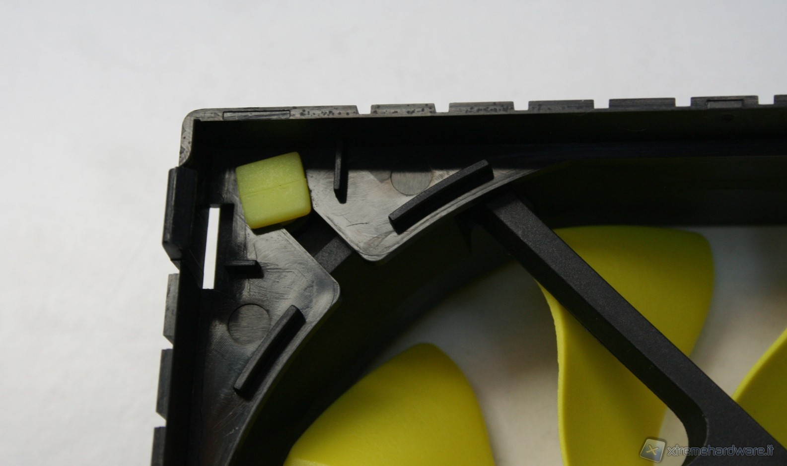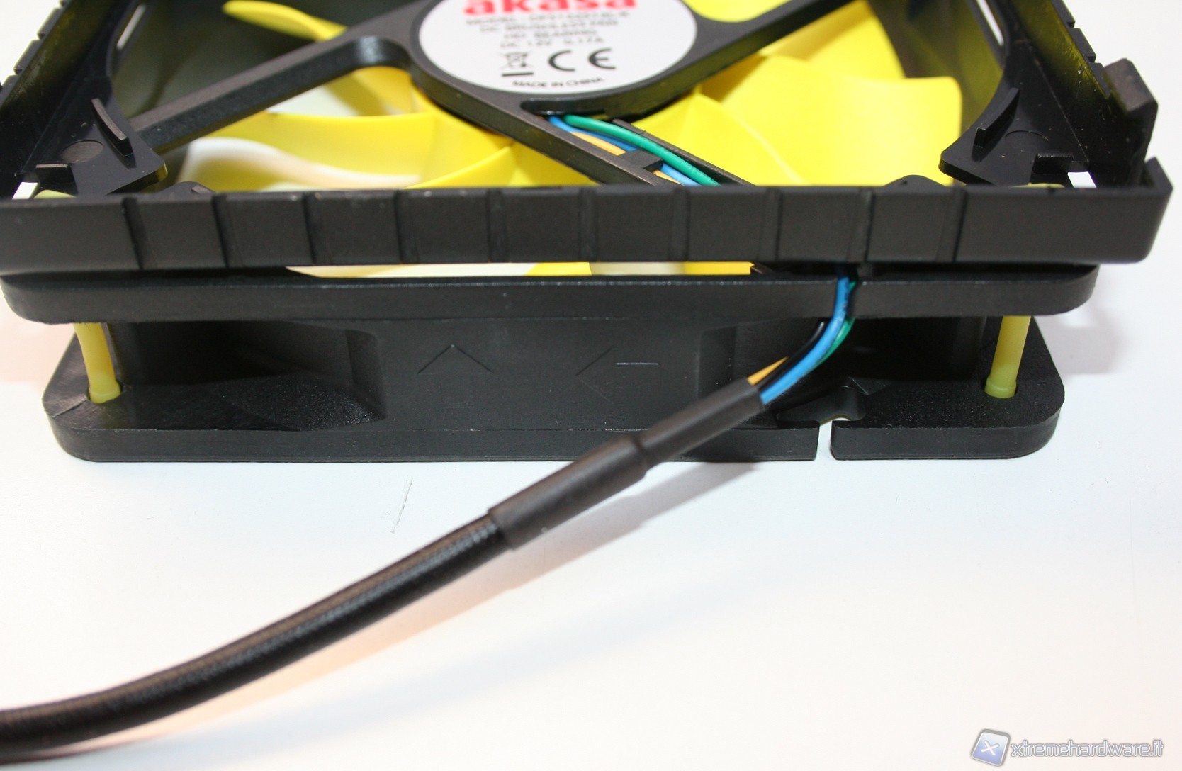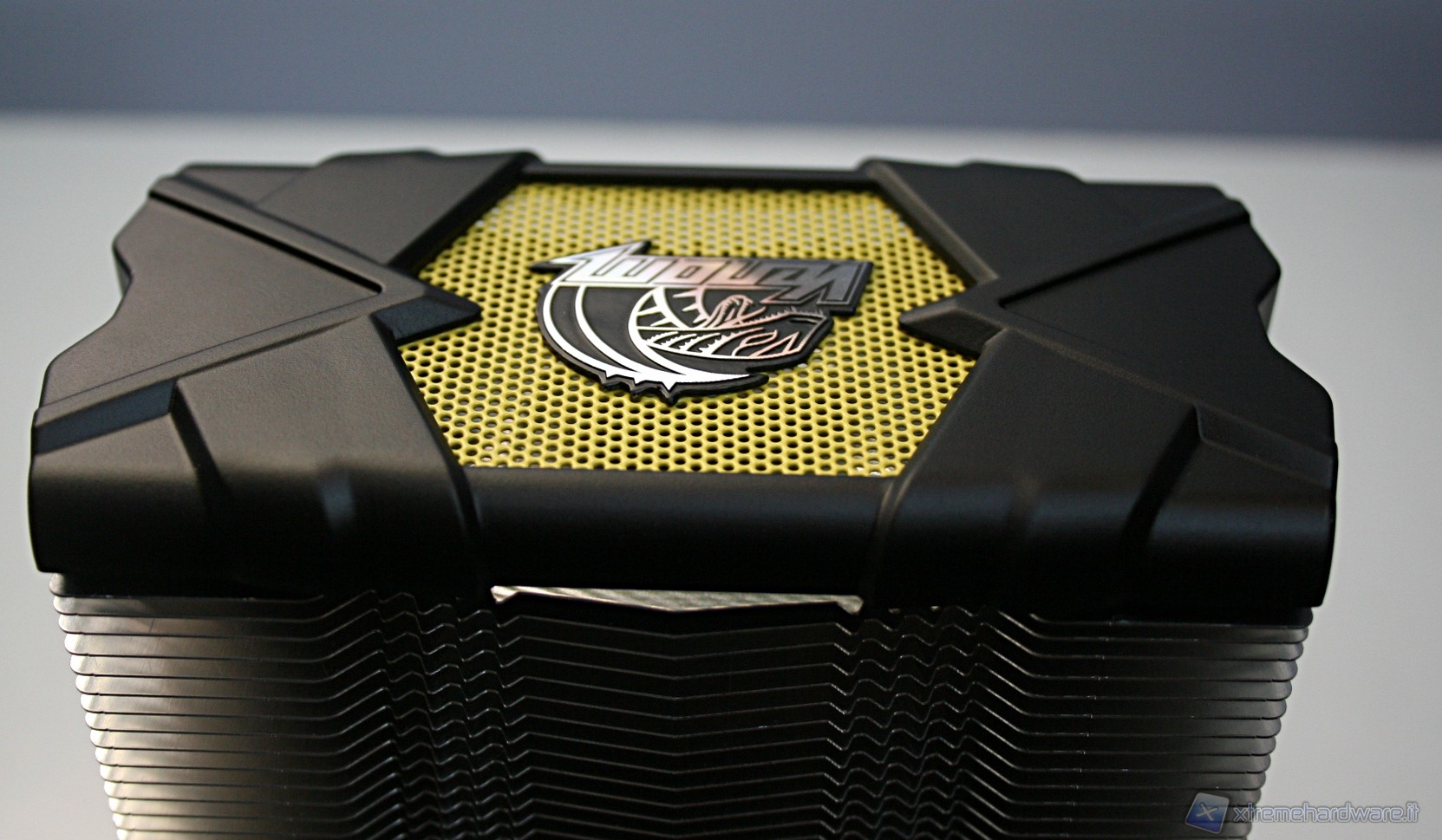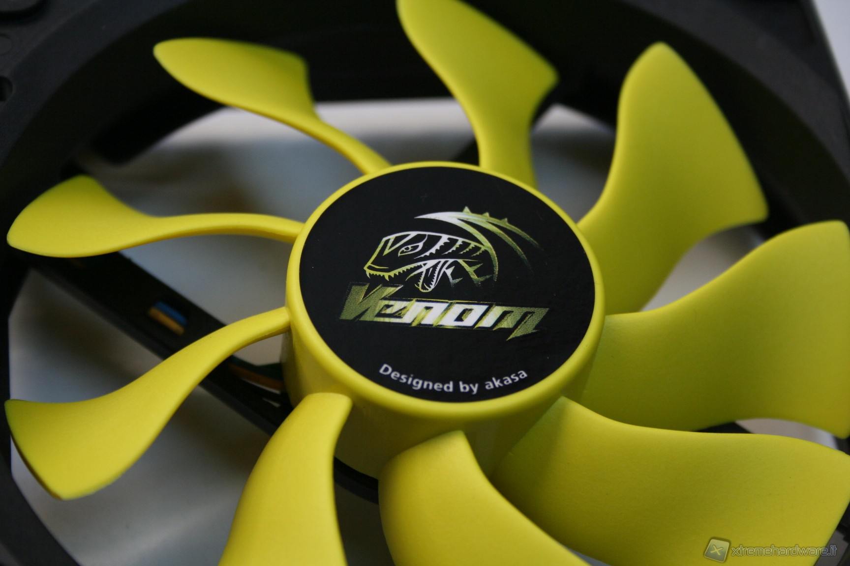 Nella parte superiore c’è una copertura di plastica dura con il logo Akasa sovrapposta ad una copertura a griglia metallica con colorazione gialla, tutto ciò conferisce un aspetto molto aggressivo e davvero di impatto. Il radiatore presenta delle lamelle sufficientemente spaziate (spesse 0.5mm e spaziate 2mm), di modo che il flusso d’aria non venga eccessivamente ostruito. Con questa struttura ci sono pochissime zone morte dove l’aria non riesce a passare, precisamente dietro ognuna delle heatpipe; in linea teorica potrebbe venire a formarsi un piccolo triangolo non areato, ma comunque è un discorso valido per una buona parte dei dissipatori attualmente in commercio quindi nulla di preoccupante. Le heatpipes sono in rame e le alette in alluminio.