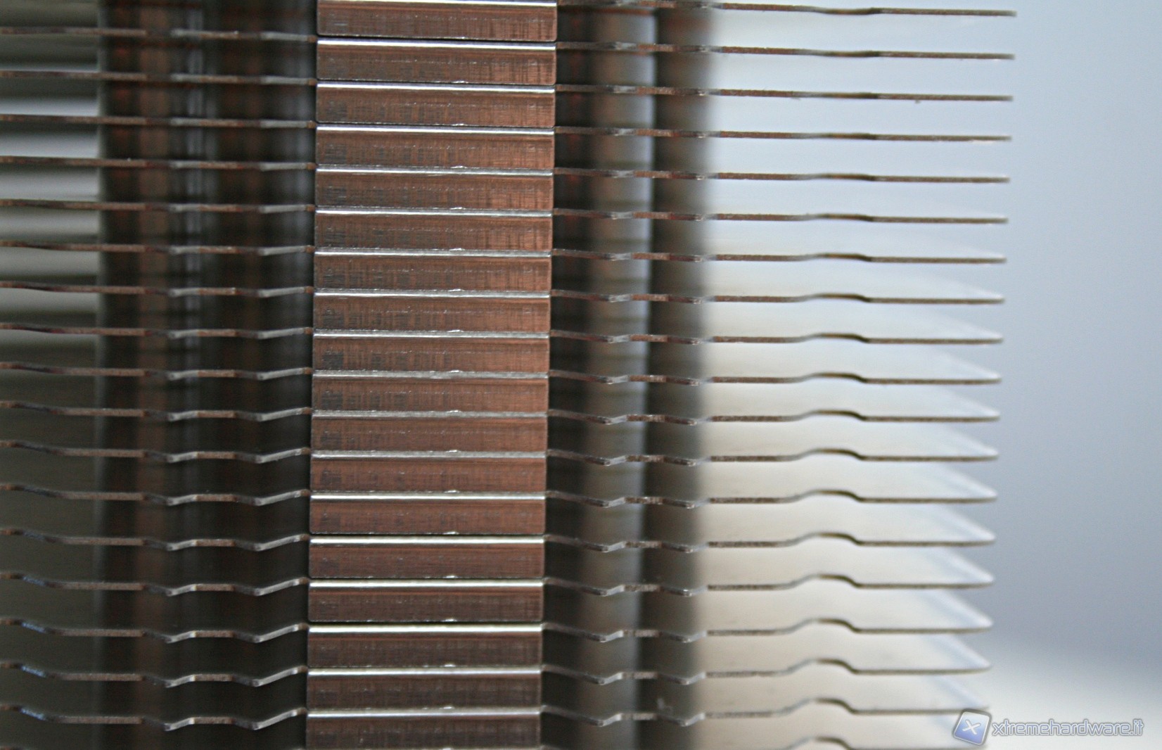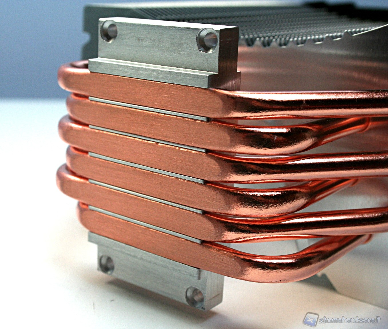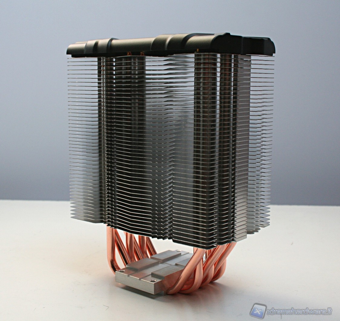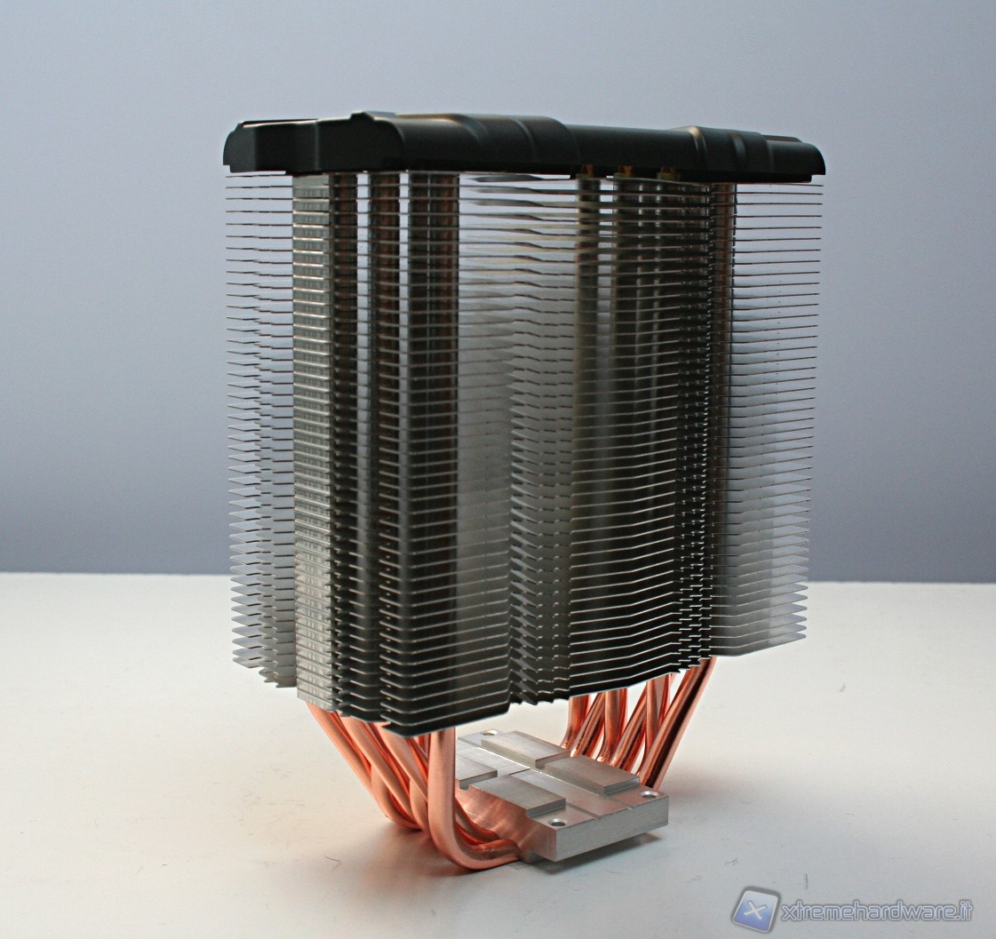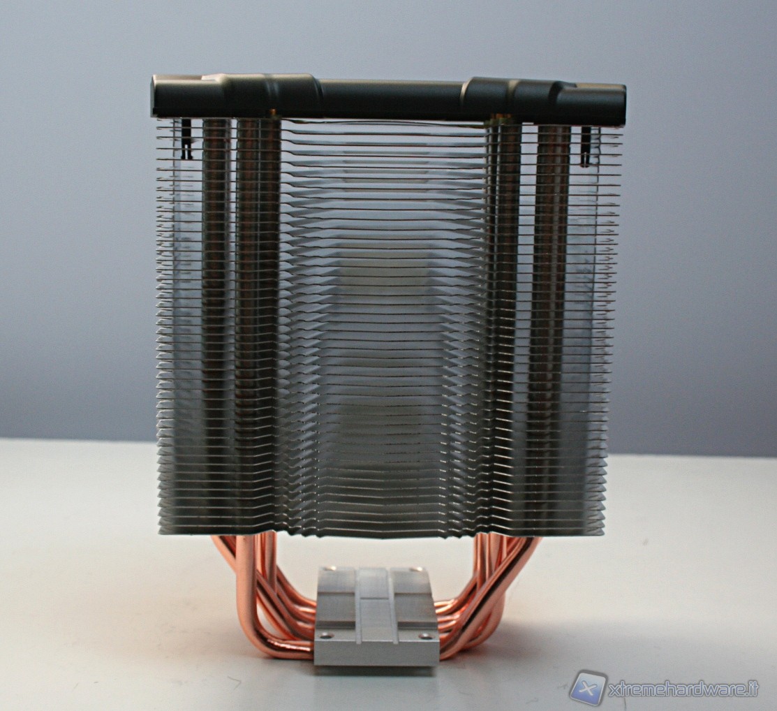 Il dissipatore presenta sei heatpipe aventi la classica struttura ad U, con un diametro di sei millimetri. La superficie dissipante è caratterizzata da 45 lamelle in alluminio ripartite in un’unica torre. Notiamo delle rientranze centrali triagolari che formano una mezzaluna dentellata e concava, sul lato di entrata dell’aria. Nel lato opposto invece è presente una struttura convessa, sempre avente queste rientranze triangolari.