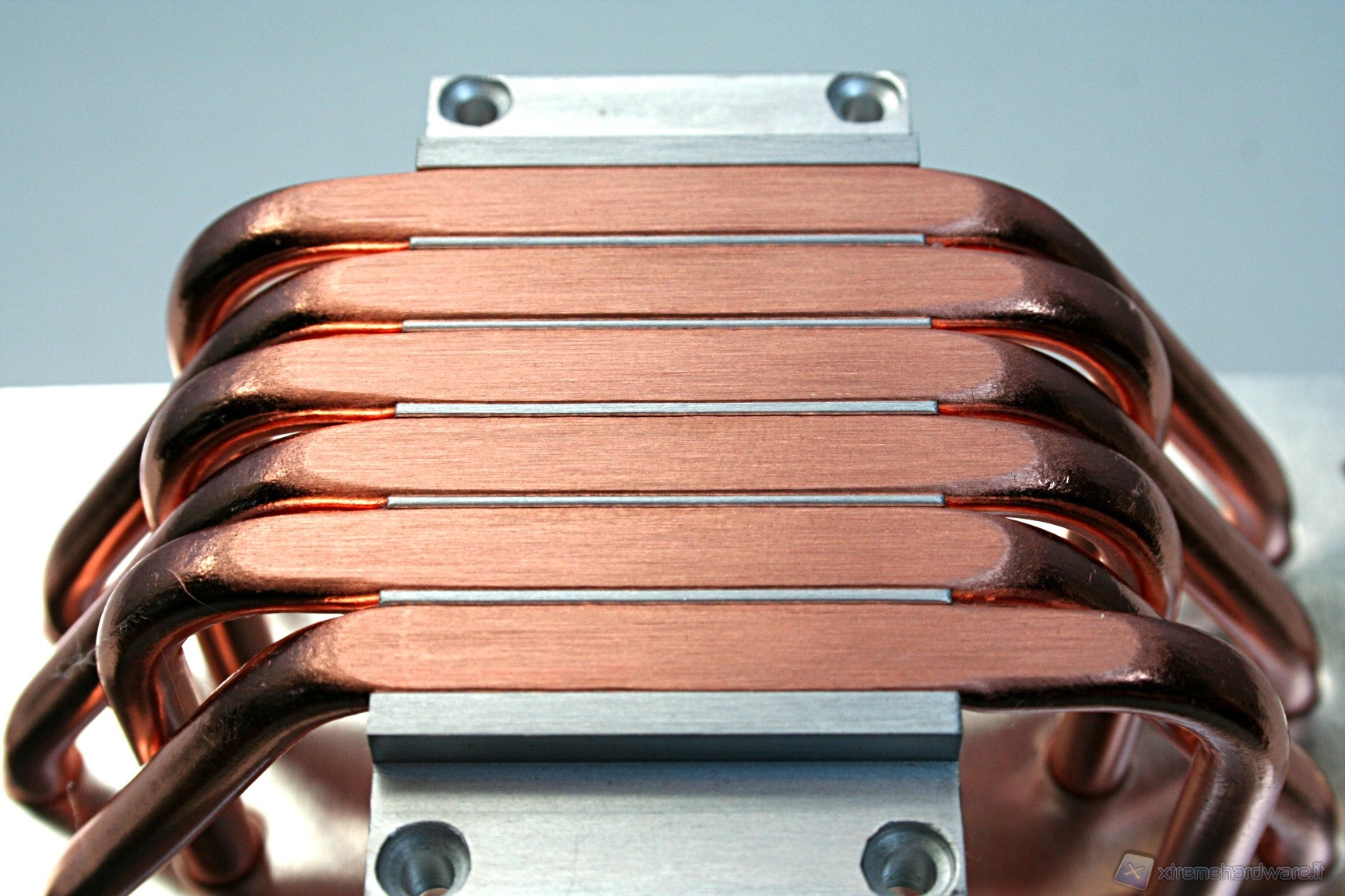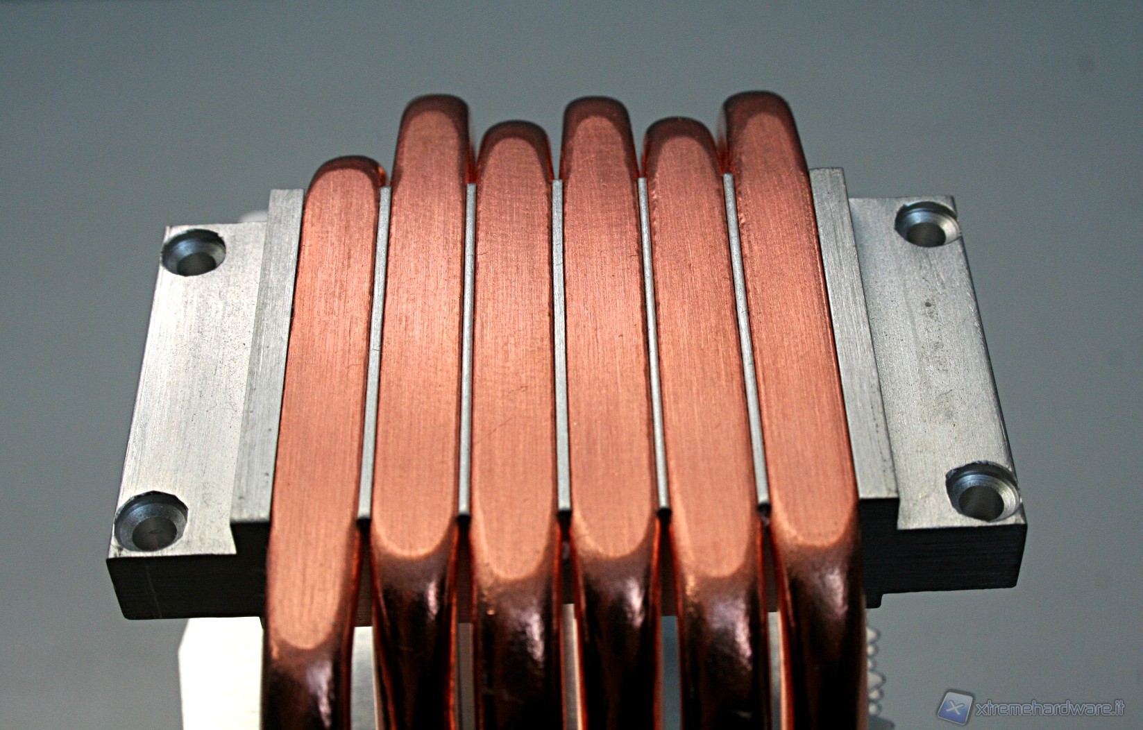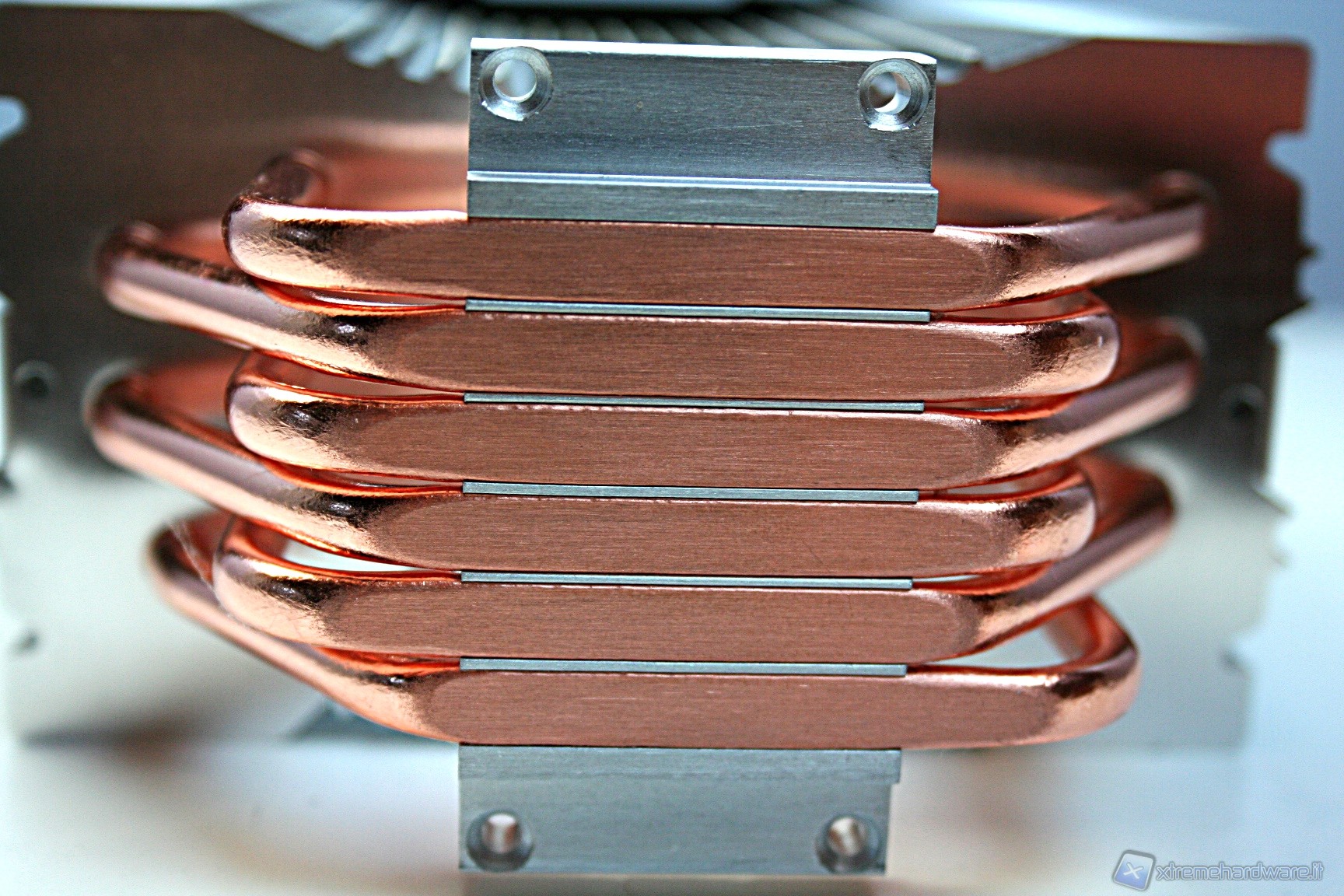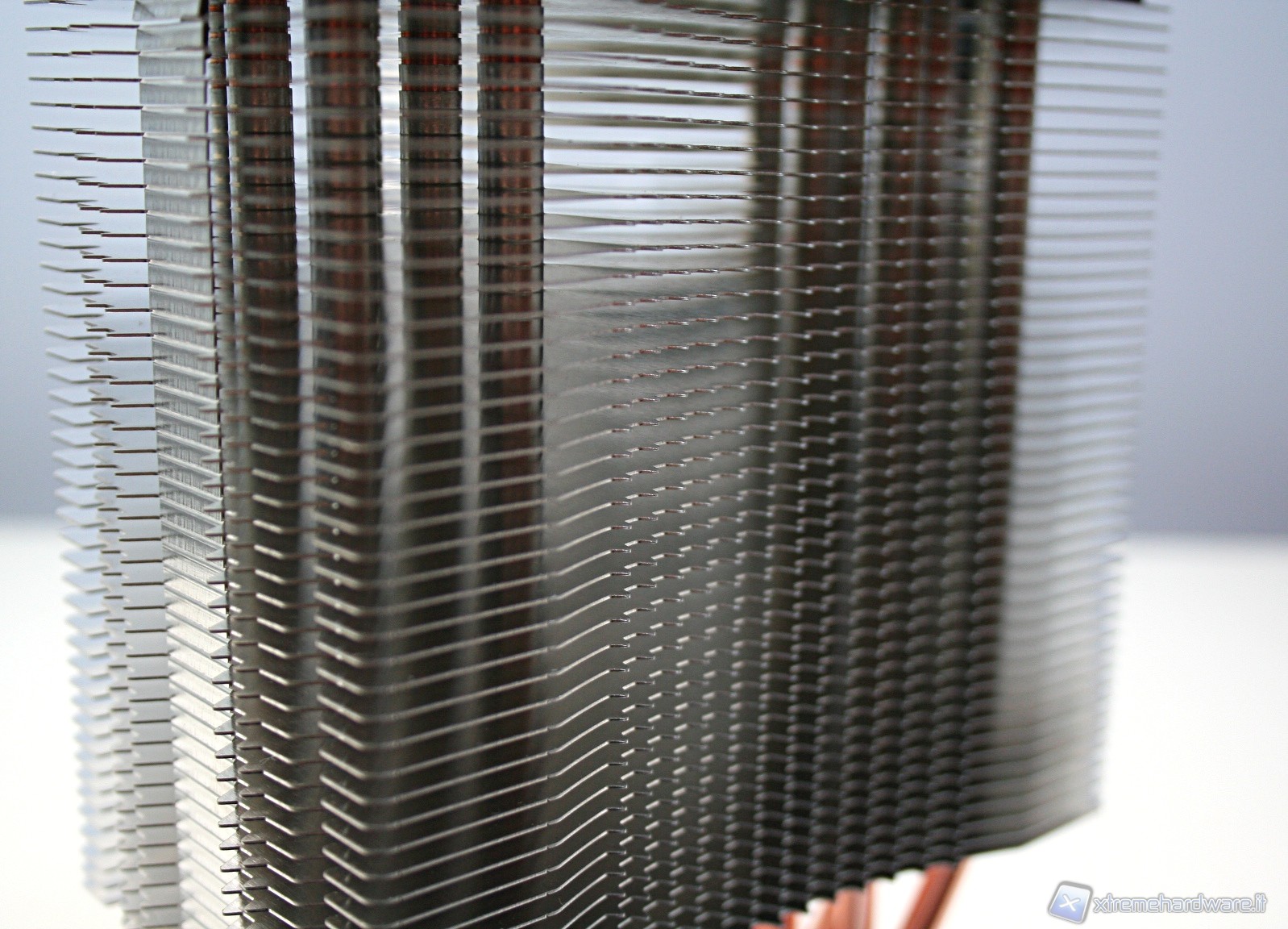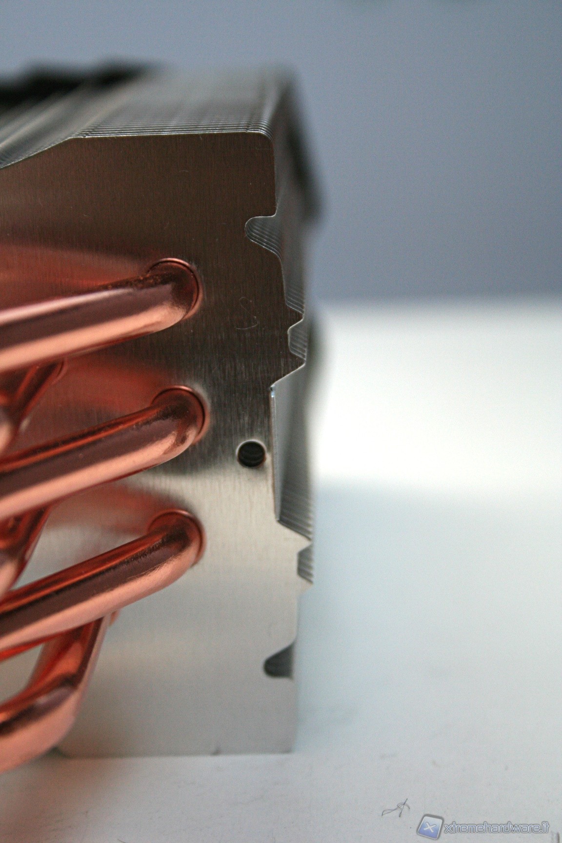 Il dissipatore presenta sei heatpipe aventi la classica struttura ad U, con un diametro di sei millimetri. La superficie dissipante è caratterizzata da 45 lamelle in alluminio ripartite in un’unica torre. Notiamo delle rientranze centrali triagolari che formano una mezzaluna dentellata e concava, sul lato di entrata dell’aria. Nel lato opposto invece è presente una struttura convessa, sempre avente queste rientranze triangolari.