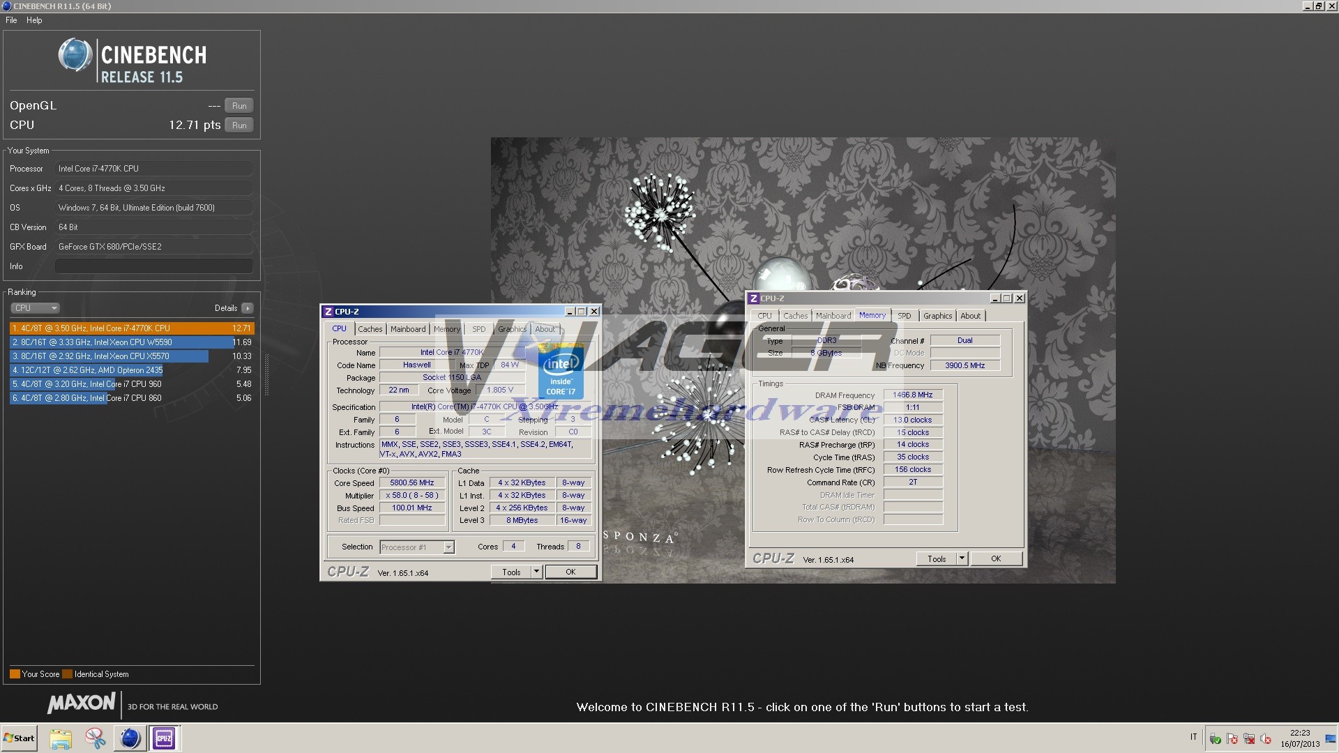 Con l’ausilio dell’azoto e senza disabilitare l’Hyperthreading siamo riusciti a spingere il processore fino ad una frequenza di 5901 MHz ed a chiudere un CinebenchR11.5 ad una frequenza di poco inferiore.